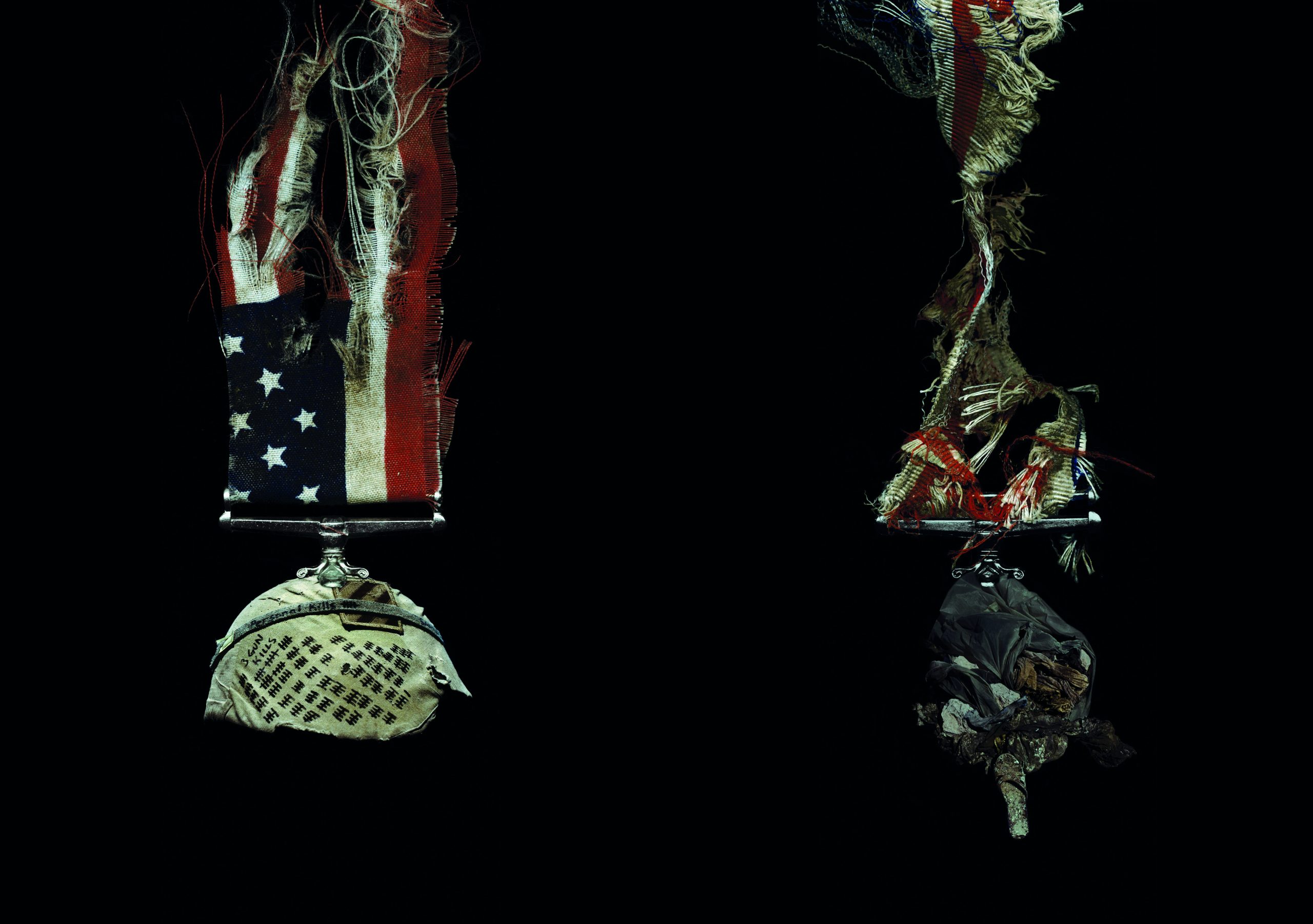 The exhibition’s powerful opening statement Decoration is a series of massive digital and painted prints of British and US war decorations from 2003, their ribbons ripped and their medallions replaced with images of bandaged heads, explosions and hooded Iraqi prisoners.