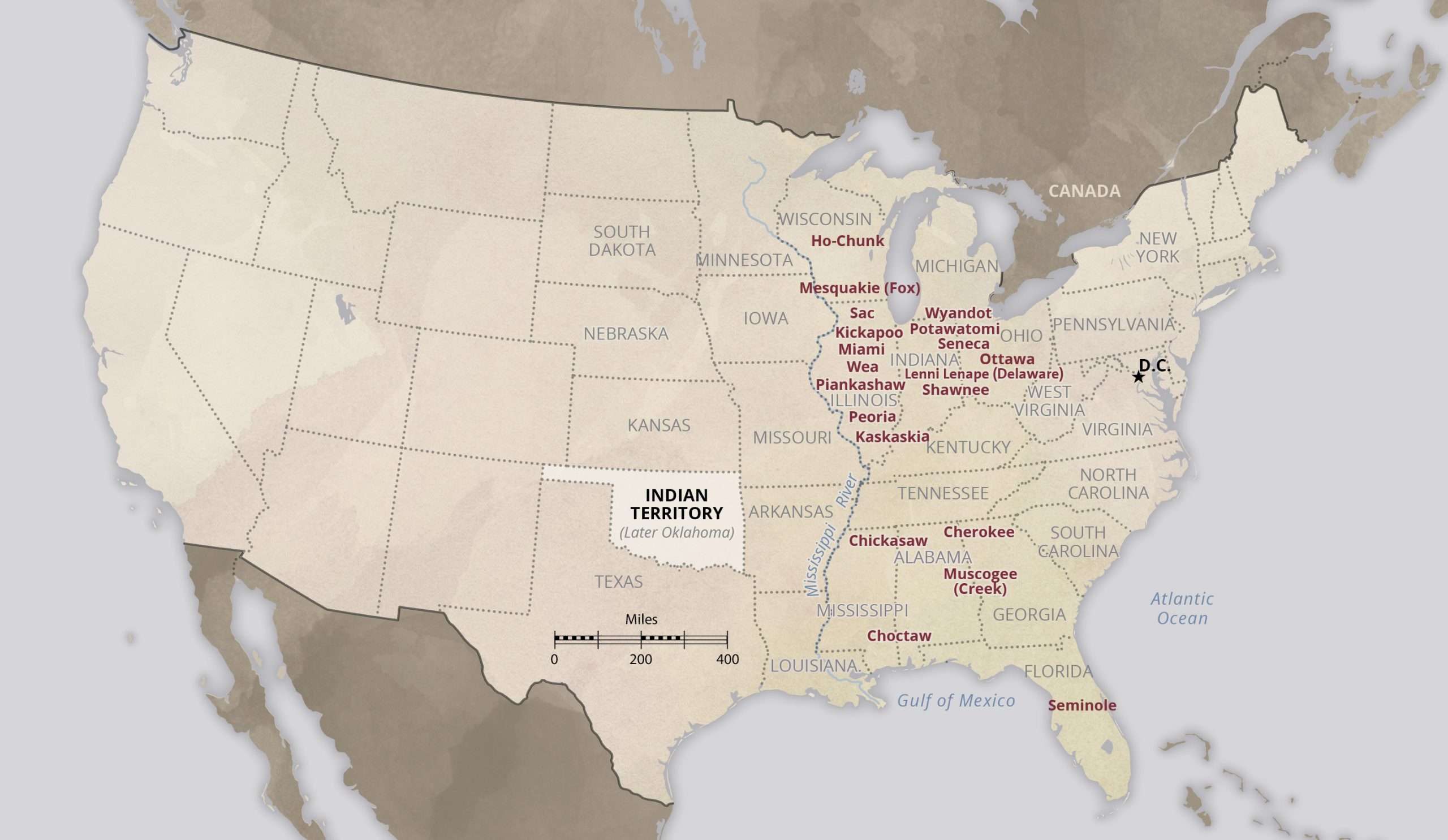 Forced removal touched every tribe east of the Mississippi River and several tribes to the west of it. In total, about 100,000 American Indians were removed from their eastern homelands to western reservations.